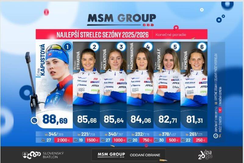Slovenský zväz biatlonu, v spolupráci so spoločnosťou MSM GROUP, vyhlásili súťaž o Najlepšieho strelca sezóny 2025/2026. Do hodnotenia sa započítavali všetky medzinárodné súťaže IBU (okrem CERC). Pretekár musel počas celej sezóny trafiť minimálne 100 terčov, aby bol zaradený do rebríčka a získal finančnú odmenu. Zároveň musel dosiahnuť aspoň jeden výsledok v prvej polovici výsledkovej listiny ktorýchkoľvek pretekov. Pre zarátanie do štatistík musel prísť do cieľa pretekov/svojho úseku štafety. A ako "Najlepší strelec sezóny 2025/2026" bola vyhlásená Ema Kapustová.